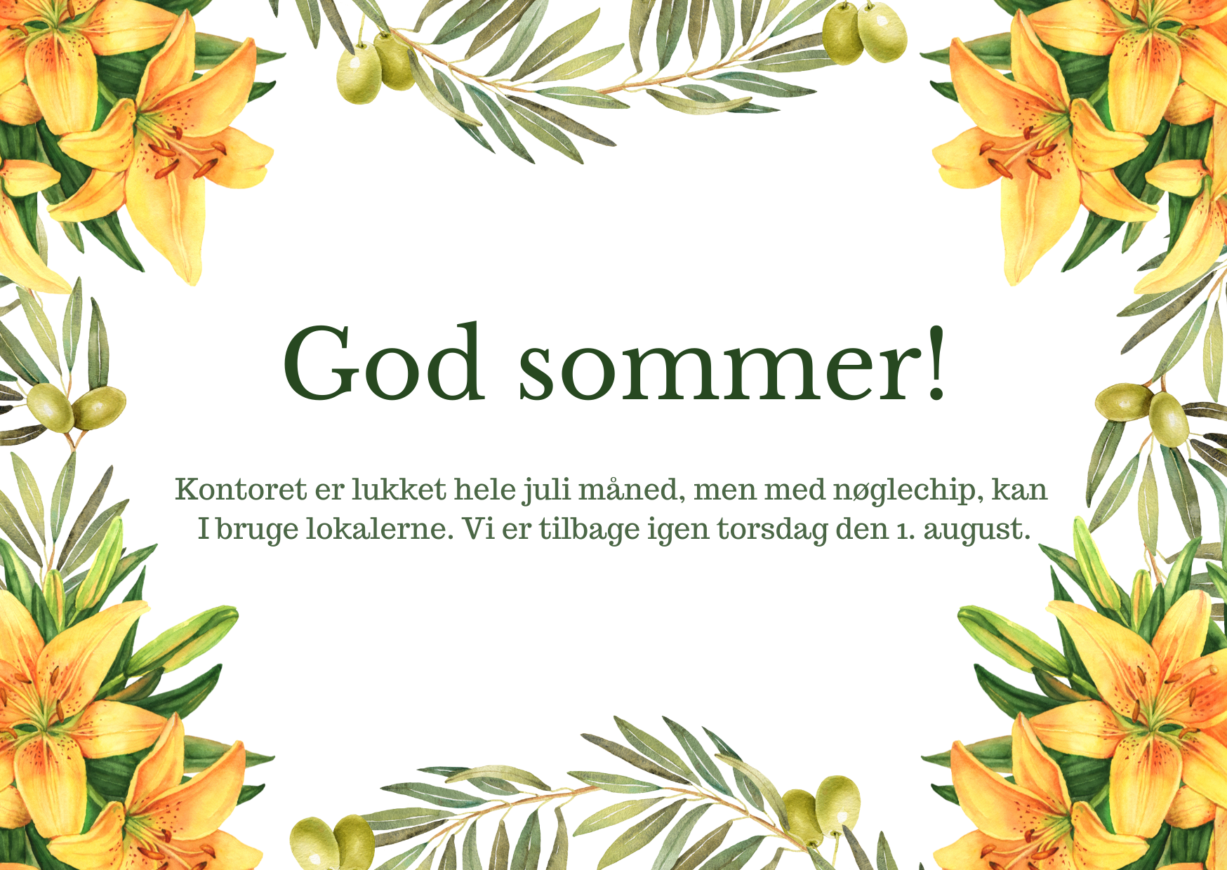 Kontoret er lukket hele juli måned, men med nøglechip, kan I bruge lokalerne. Vi er tilbage igen torsdag den 1. august.