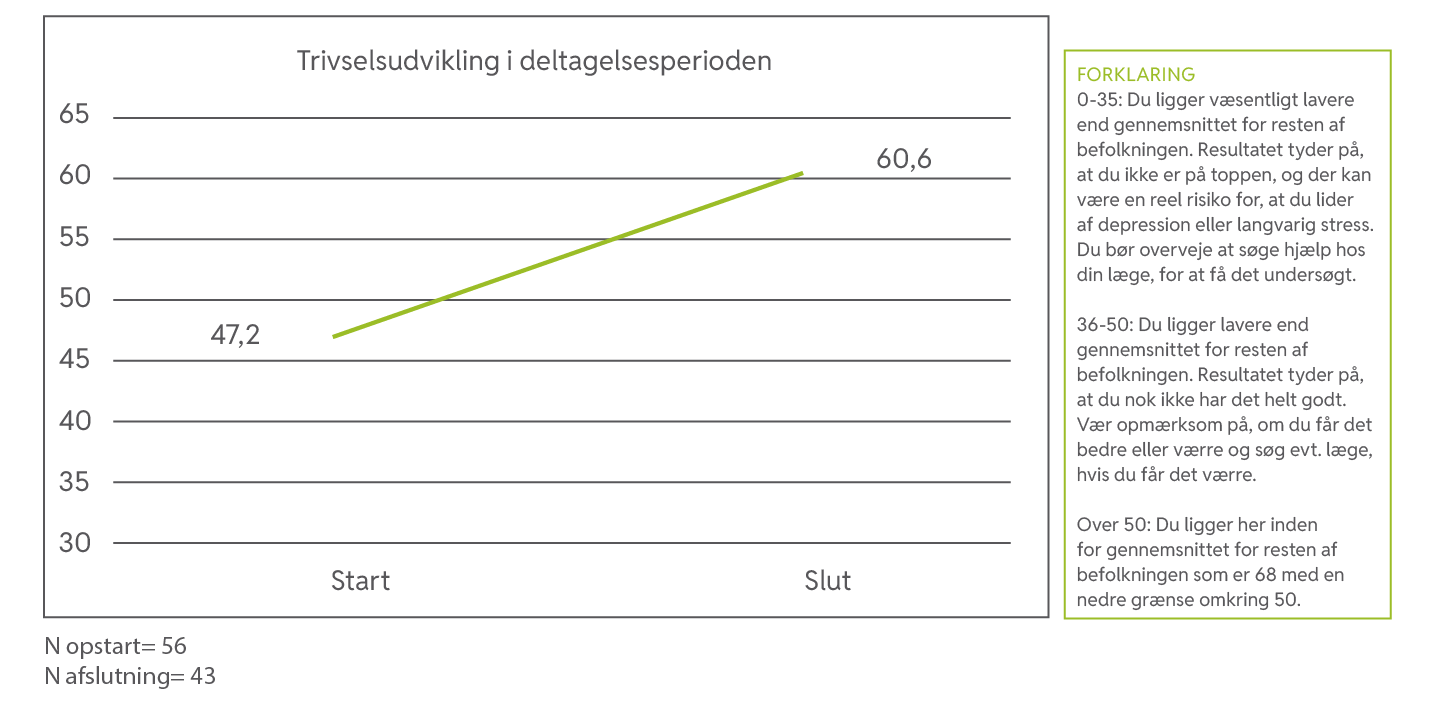 Datasættet består af 56 besvarelser fra opstartsmødet og 43 fra det afsluttende møde. Resultaterne af disse målinger viser, at deltagernes gennemsnitlige trivselspoint stiger fra 47,2 til 60,6 i deltagelsesperioden. Det betyder, at den generelle trivsel er steget 13,4 procentpoint eller 28,6 procent. Resultaterne beror på data fra 56 besvarelser ved opstart og 43 besvarelser ved afslutning.