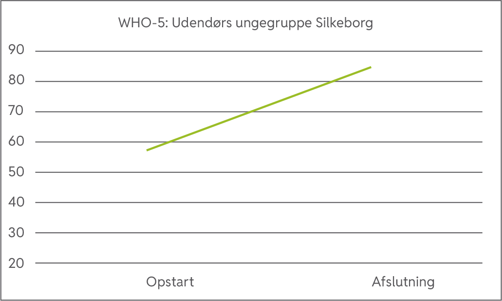 Gruppen mødtes udendørs ved Silkeborg Ungdomsskole nye bålhytte. Gruppen havde ni tilmeldte deltagere ved opstart. To deltagere mødte aldrig op, trods ønske om at deltage – en deltog to gange, men forsætte ikke efterfølgende. Seks deltagere fuldførte hele gruppeforløbet. I denne udendørsgruppe for unge gjorde man meget ud af at inddrage naturen.